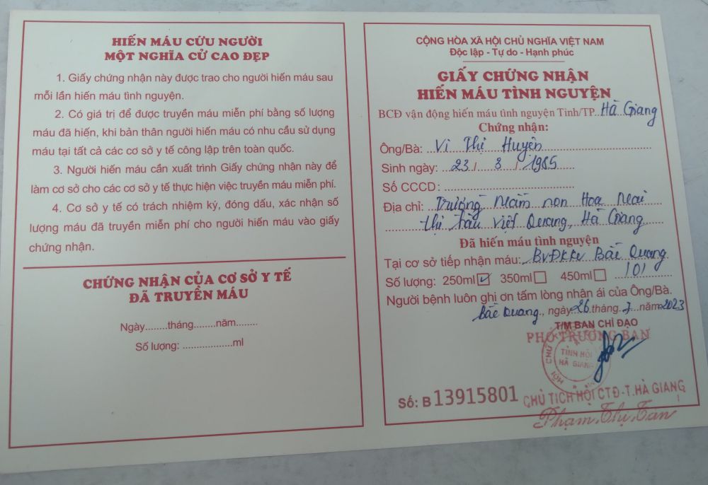 ♥️♥️♥️. MỖI NGÀY MỘT VIỆC TỐT 🩸Hiến máu tình nguyện là một việc làm có ý nghĩa, thể hiện trách nhiệm với cộng đồng, nghĩa cử hiến máu cứu người luôn cao đẹp, cần được phát huy. Hiến máu đem lại cho ta niềm vui vì được giúp đỡ ai đó đang cần lượng máu quý giá. Thật vui khi được cứu sống mạng người, vì thế mỗi chúng ta nên nhân nhiều niềm vui ấy bằng cách sẵn sàng hiến máu tình nguyện khi có thể. Hằng ngày, hằng giờ có rất nhiều người bệnh cần máu. 🩸 Sáng nay ngày 26/7/2023 cô giáo Vi Thi Huyện: GV trường MN Hoa Mai huyện Bắc Quang đã tình nguyện hiến 1 đơn vị 🩸 để lưu dữ trữ cho kho máu của Bệnh viện đa khoa khu vực Bắc Quang. Đây là việc làm ý nghĩa, thể hiện trách nhiệm với cộng đồng, xây dựng hình ảnh đẹp của VCQL- GV-NV trường MN Hoa Mai. 🩸Tin bài Phạm Nhung.